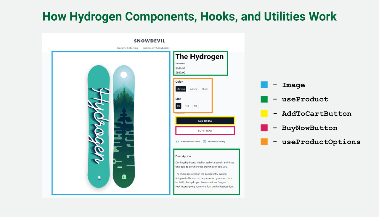 Thus, using a mix of Hydrogen components, hooks, and utilities, you can assemble a fully functional product page for your storefront without starting from scratch.