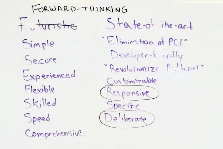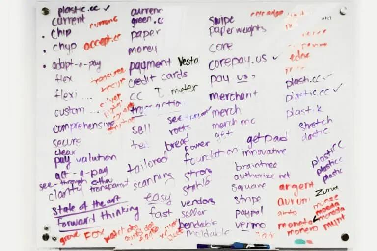 With the brand statements in hand, my team and I were ready to delve into the task of actually coming up with a name for the new product. In brief, the product would be a state-of-the-art payment processing platform that offered customizability and flexibility, and whose polished user experience would inspire confidence and exude reliability and security.