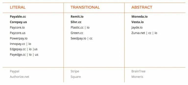 The literal names all had some reference to payment or money in them, for example Payable or EdgePay. For existing examples, we pointed to PayPal and Authorize.net.