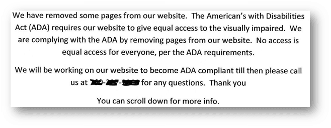 Some websites having already experienced ADA lawsuits levied against them now have ugly disclaimers front and center on their homepage pushing down valuable information about their actual business below the fold, which is a form of Siberia for website content: