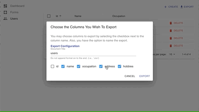 ... const handleExport = () => { /** * Convert the checkbox state object back into an array of strings * i.e., ['id', 'name'] */ const exportColumnsArray = allColumnsArray.filter( (col) => exportColumns[col] ); /** * After user is done figuring, call the custom export function */ customExporter( usersArray, exportColumnsArray, allColumnsArray, documentTitle ); setOpen(false); }; ...