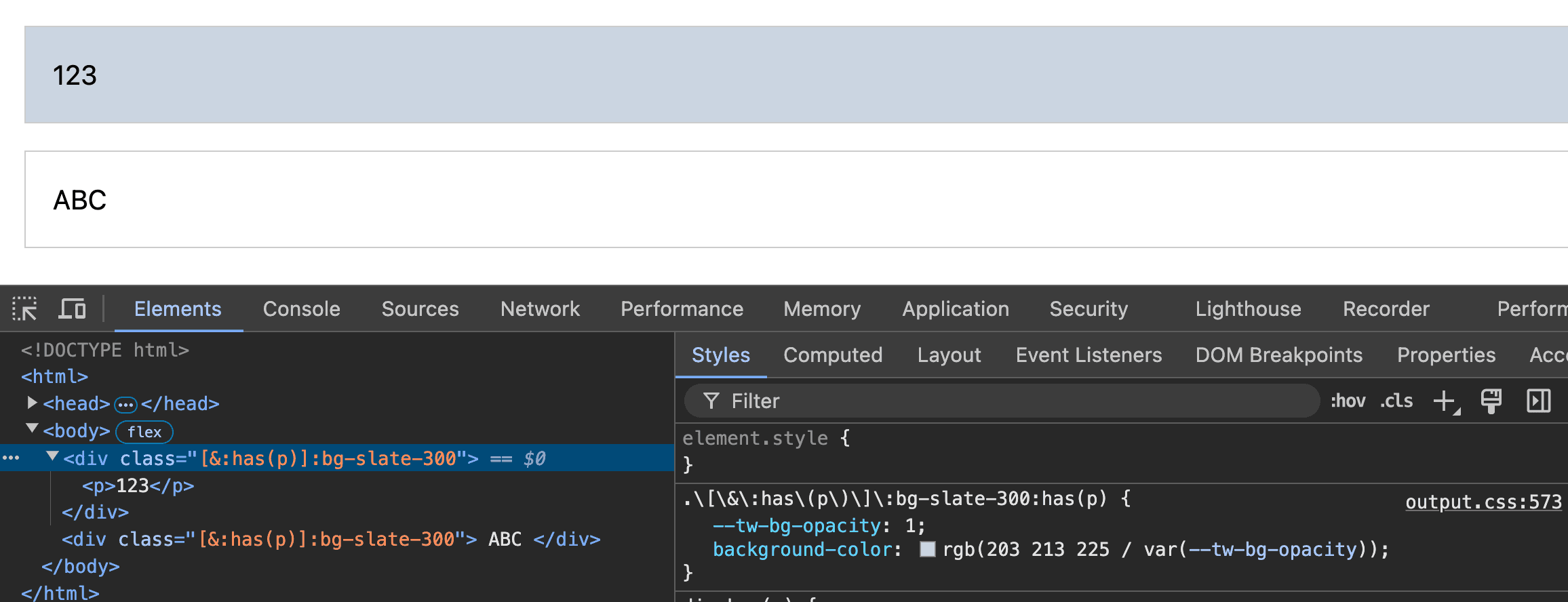 <div class="[&:has(p)]:bg-slate-300">