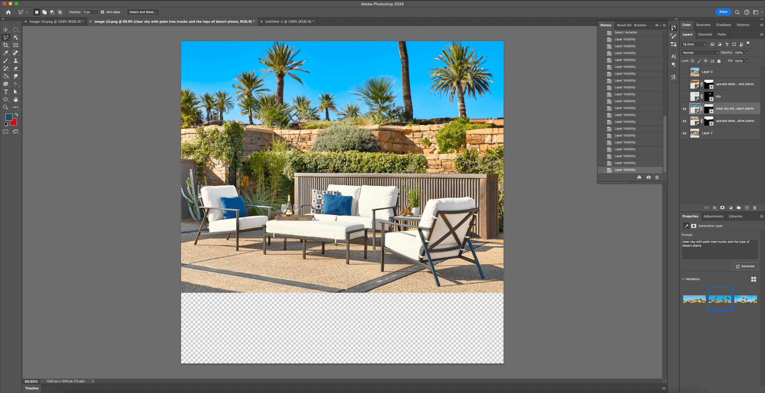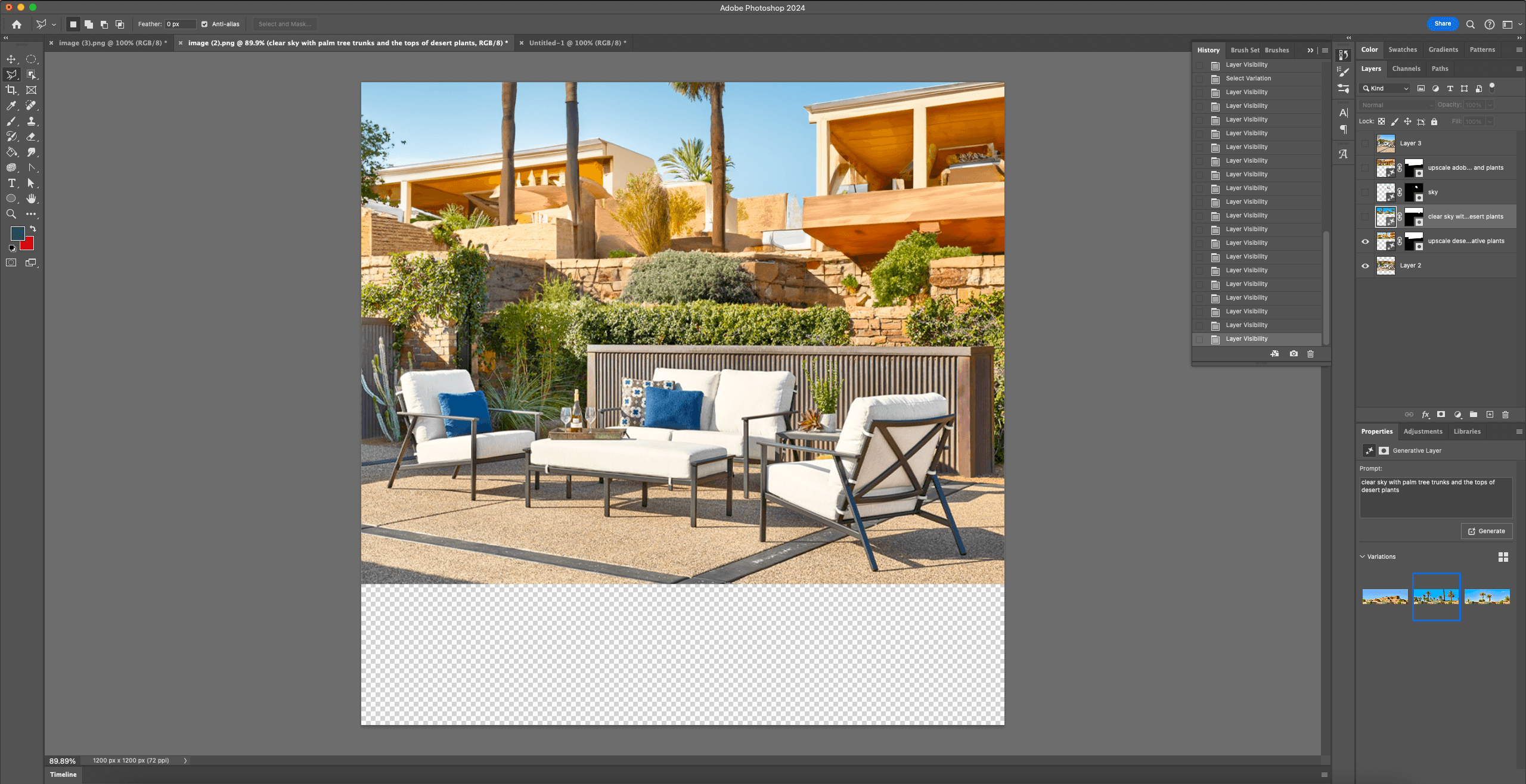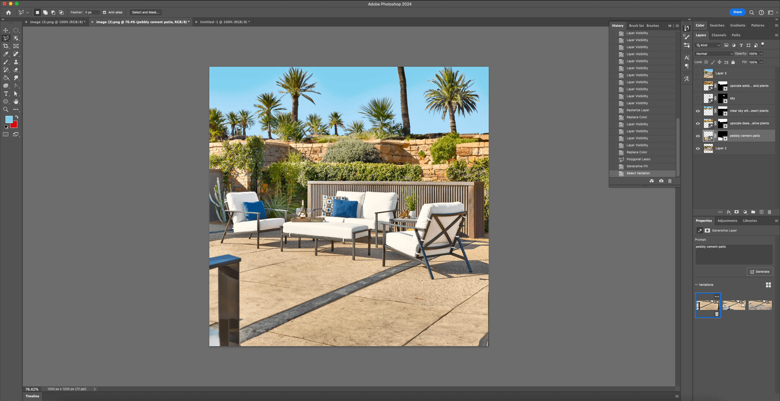 To address these issues, we'll have to go in and manually touch up the new parts of the image, using Generative Fill again to get rid of the random furniture frame, plus some old-fashioned tools like the healing brush to get rid of the artifacts and the clone tool to copy some of the existing patio texture onto the new areas.