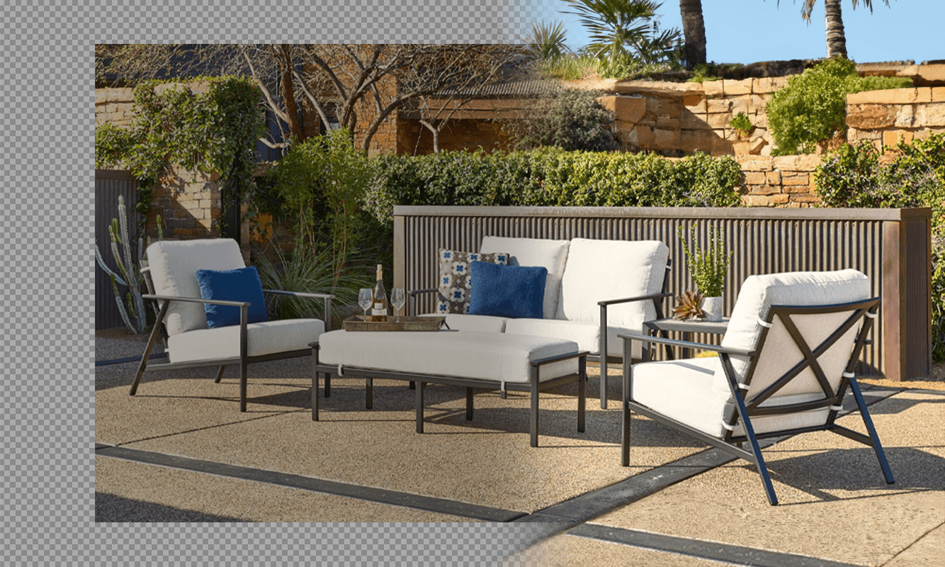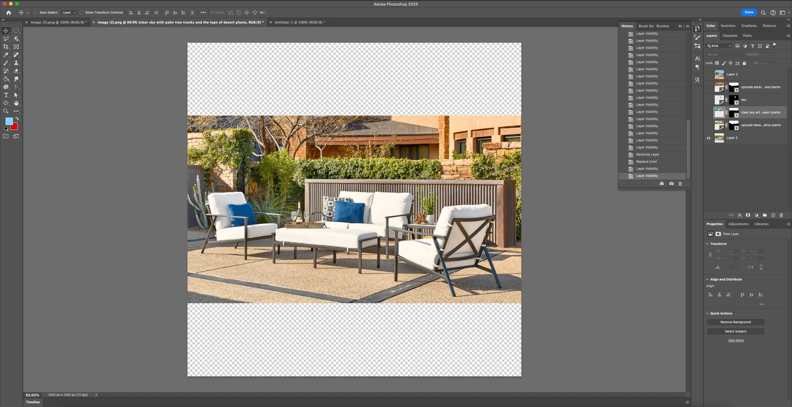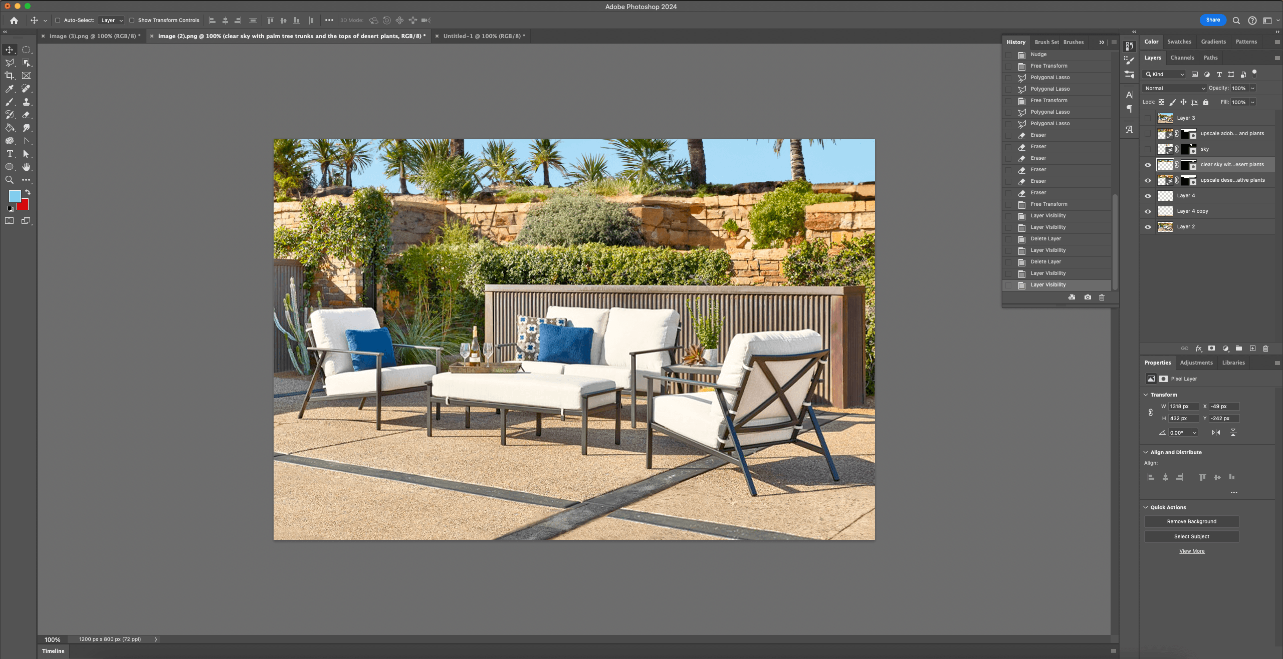To address these issues, we'll have to go in and manually touch up the new parts of the image, using Generative Fill again to get rid of the random furniture frame, plus some old-fashioned tools like the healing brush to get rid of the artifacts and the clone tool to copy some of the existing patio texture onto the new areas.