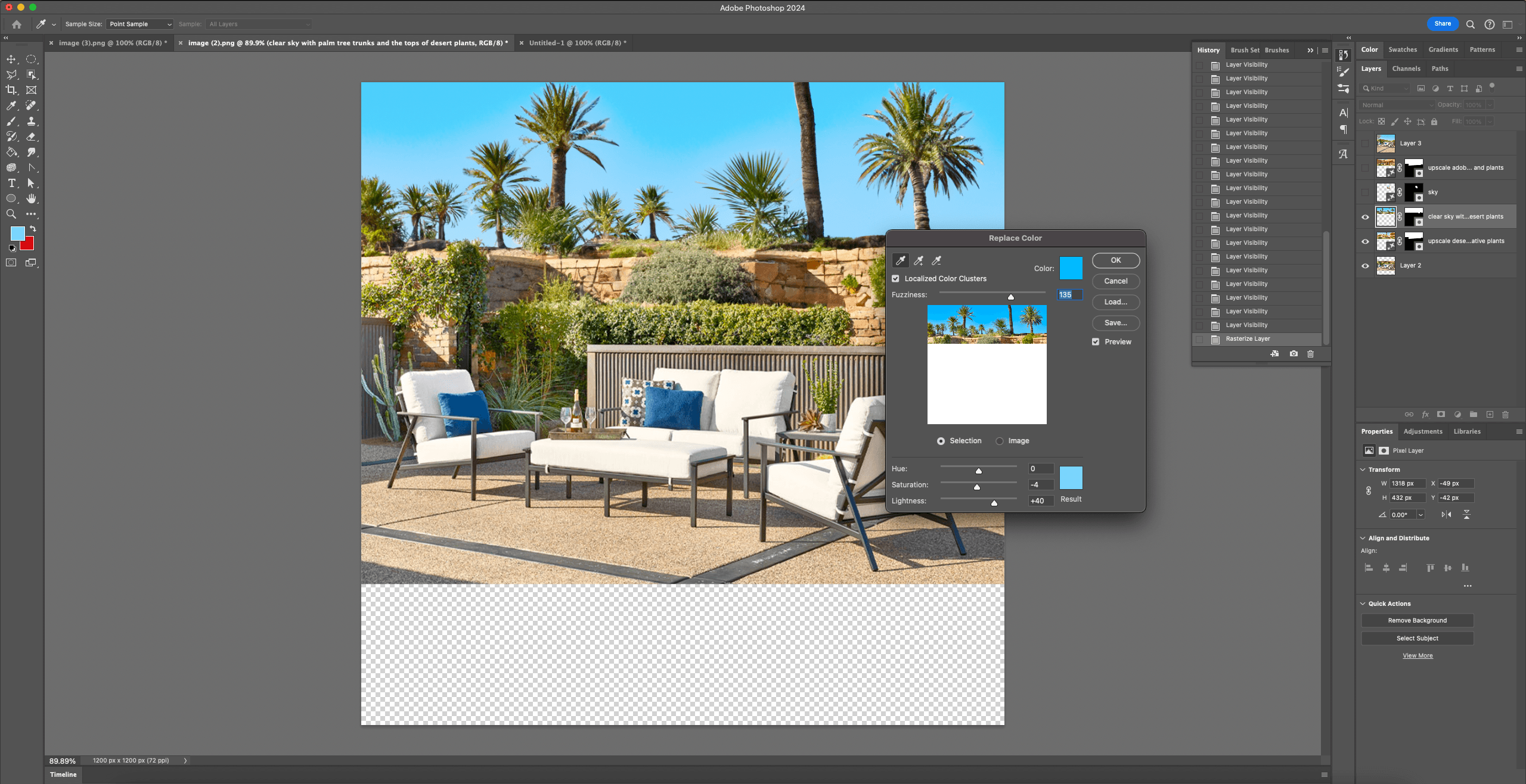 4. The added sky looks great, expect it's too saturated, so we tone that down.