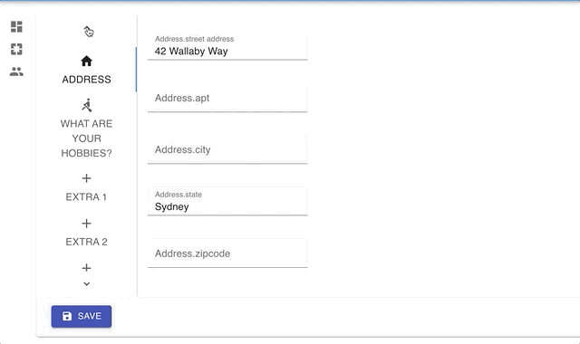 export const UsersCreate = props => ( <Create {...props}> <VerticalTabbedForm> <FormTab label="General Information"> <TextInput source="id"/> <TextInput source="name"/> <TextInput source="occupation"/> </FormTab> <FormTab label="Address"> <TextInput source="address.streetAddress"/> <TextInput source="address.apt"/> <TextInput source="address.city"/> <TextInput source="address.state"/> <TextInput source="address.zipcode"/> </FormTab> <FormTab label="What Are Your Hobbies?"> <ArrayInput source="hobbies"> <HobbiesCustomIterator/> </ArrayInput> </FormTab> </VerticalTabbedForm> </Create> );