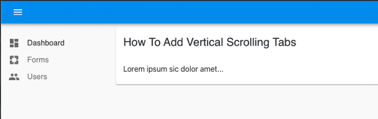 ... import Tabs from '@material-ui/core/Tabs'; import Tab from '@material-ui/core/Tab'; import AccountBoxIcon from '@material-ui/icons/AccountBox'; import HomeIcon from '@material-ui/icons/Home'; import RowingIcon from '@material-ui/icons/Rowing'; import AddIcon from '@material-ui/icons/Add'; import withStyles from '@material-ui/styles/withStyles'; import Typography from '@material-ui/core/Typography'; const MuiTabs = withStyles({ root: { borderRight: '1px solid #CCC' } })(Tabs); const CustomTabs = (props) => { return ( <MuiTabs orientation="vertical" variant="scrollable" value={props.value} aria-label="Vertical tabs example" onChange={props.onChange} > <Tab label="General Information" icon={<AccountBoxIcon />} /> <Tab label="Address” icon={<HomeIcon />} /> <Tab label="What Are Your Hobbies?" icon={<RowingIcon />} /> <Tab label="Extra 1" icon={<AddIcon />} /> <Tab label="Extra 2" icon={<AddIcon />} /> <Tab label="Extra 3" icon={<AddIcon />} /> <Tab label="Extra 4" icon={<AddIcon />} /> <Tab label="Extra 5" icon={<AddIcon />} /> </MuiTabs> ) } ...