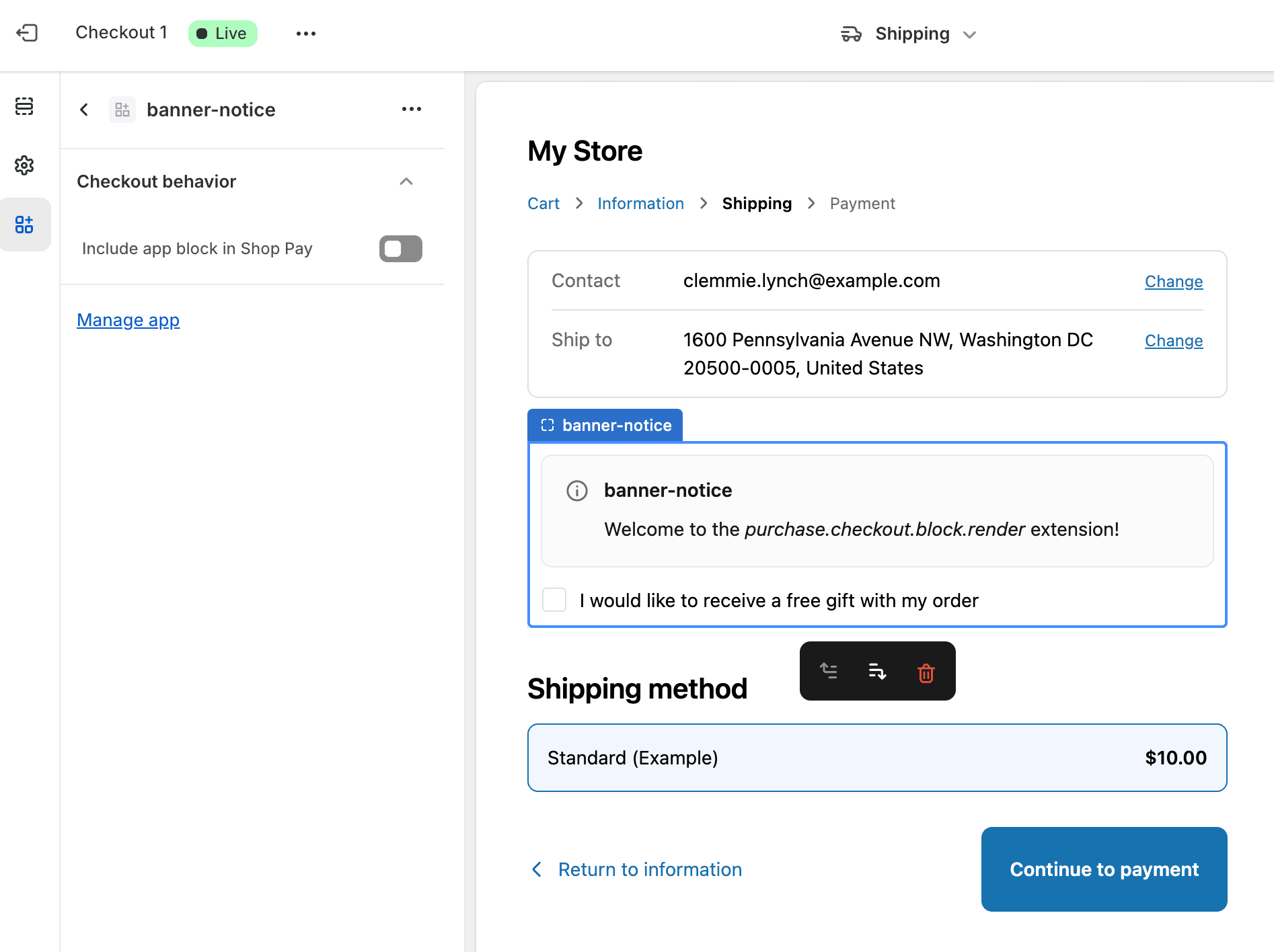 For our notice banner, we're using the block target `purchase.checkout.block.render