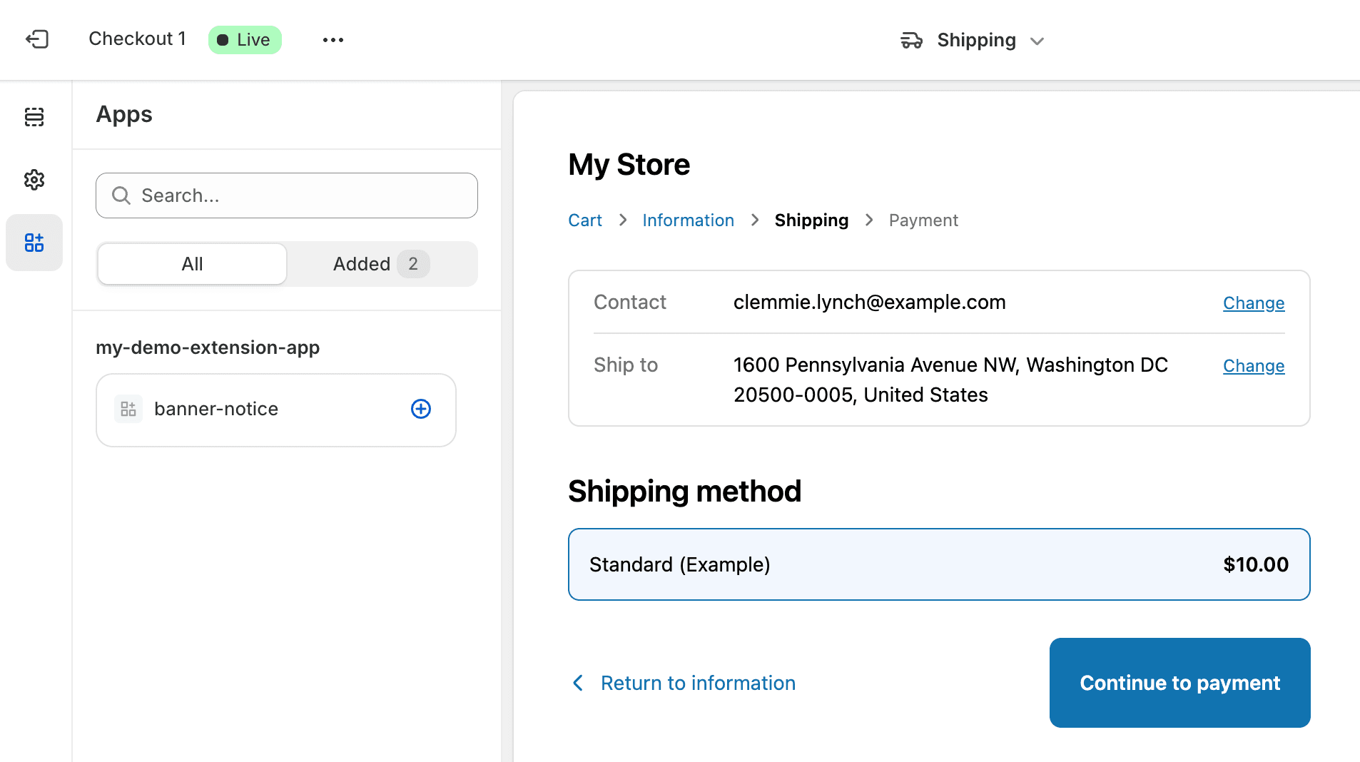 Last is to test your extension on your store! Create a test order and proceed to checkout. You should be seeing your banner during the step you selected!
