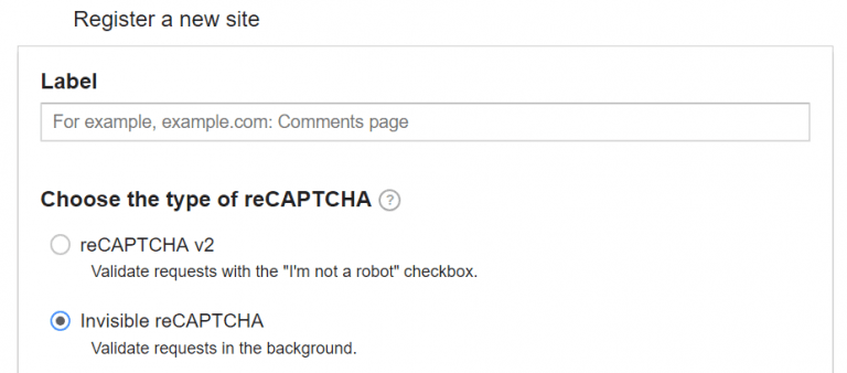 On that page you’ll see the “Register a new site” heading. Make sure you specify “Invisible reCAPTCHA” when creating the key.