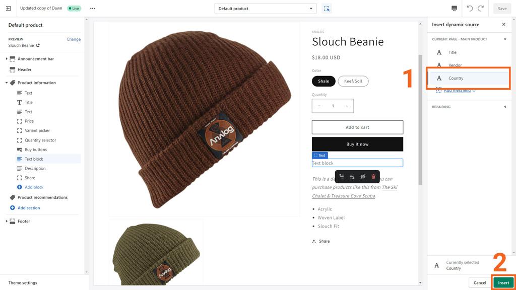 After that, click Insert to add the metafield to the page and add some text before it for more context. For instance, here, we’ve added “Country of Manufacture: ”.