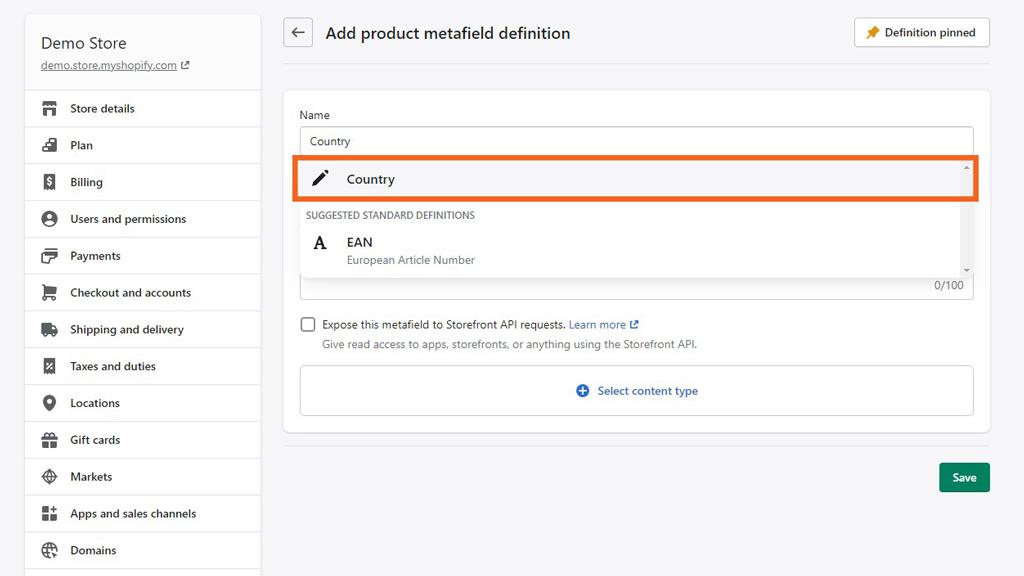 In the Name field, enter a descriptive name for your metafield definition. For example, Country. Then, choose a standard definition from the available list.
