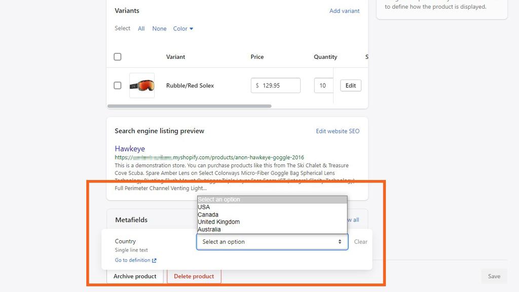 On the product editing page, scroll to the Metafields sections and click on the empty space next to the Country metafield.