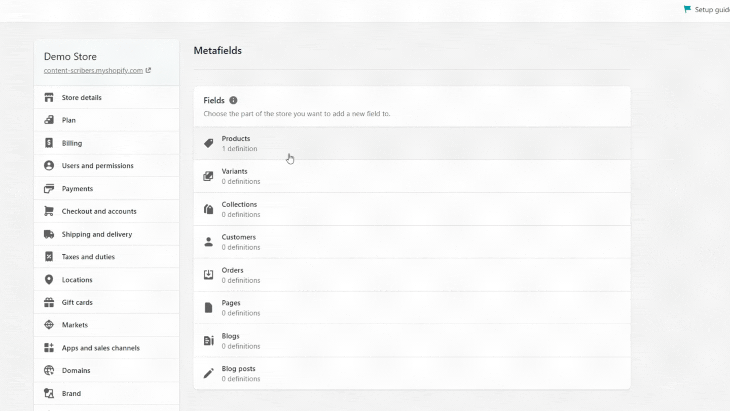 Select a resource to add a metafield, such as Products, and click Add definition.