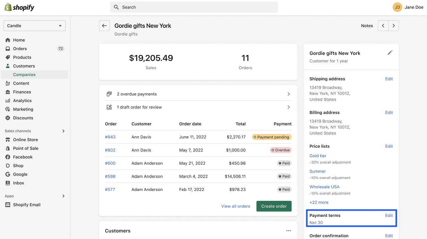 The payment terms in Shopify Plus B2B allows you to assign a duration for companies or individual company locations to pay for their orders. You can set payment terms for each customer account as Net 7, Net 15, Net 30, Net 60, or Net 90.
