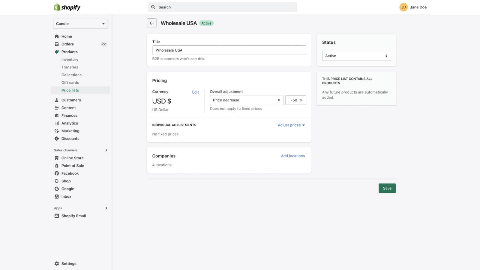 For example, suppose you sell led bulbs for $10 each. In that case, you can create a price list with a 10% discount for a company. When a customer from that company places an order for those bulbs, they’ll be charged $9 per bulb whereas all other customers will pay full price for it.
