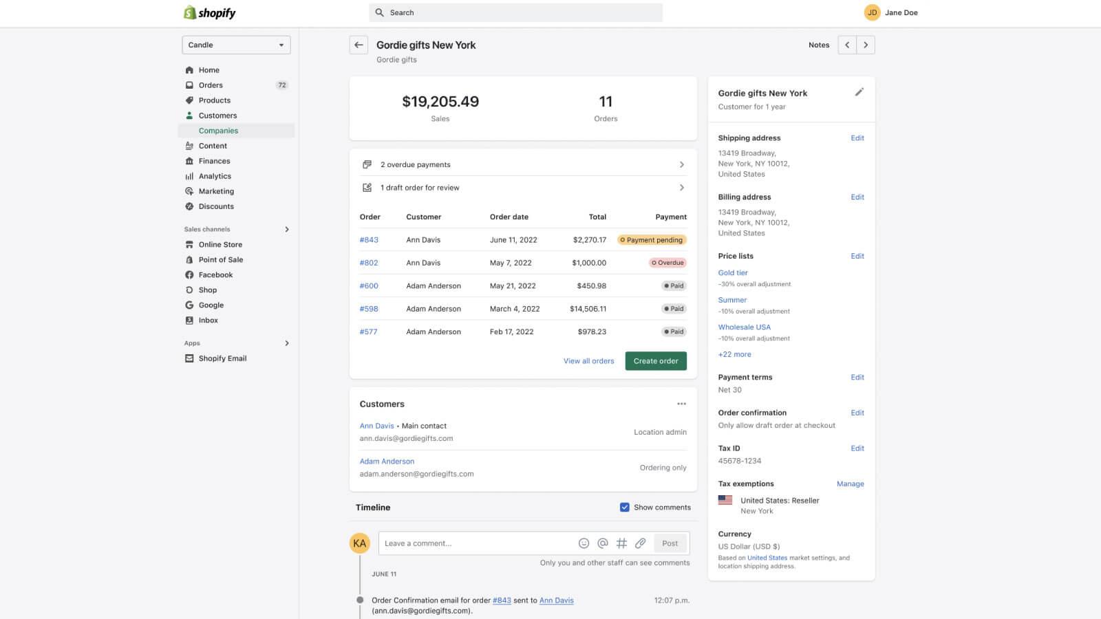 Company profiles in Shopify are a type of customer account that supports multiple sub-users, custom price lists, special payment terms, and tax exemptions. Enabling company accounts on your Shopify Plus B2B store allows you to offer B2B buyers the convenience of ordering for multiple branches of their company from a single user account.
