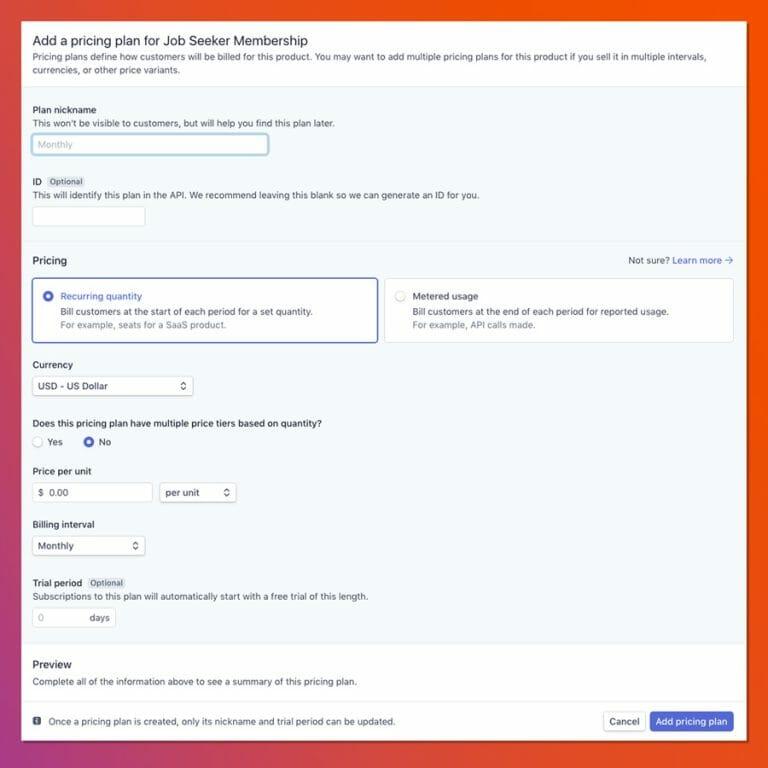 We built an interface to allow the client to define the plan, and to create a few rules, to handle various customizable options. When a subscription plan is created, an equivalent plan gets created in Stripe. Stripe only needs the name of the plan, the price, and the frequency. All business rules were handled by our customized application; this included pricing, which in turn, is also stored in Stripe.