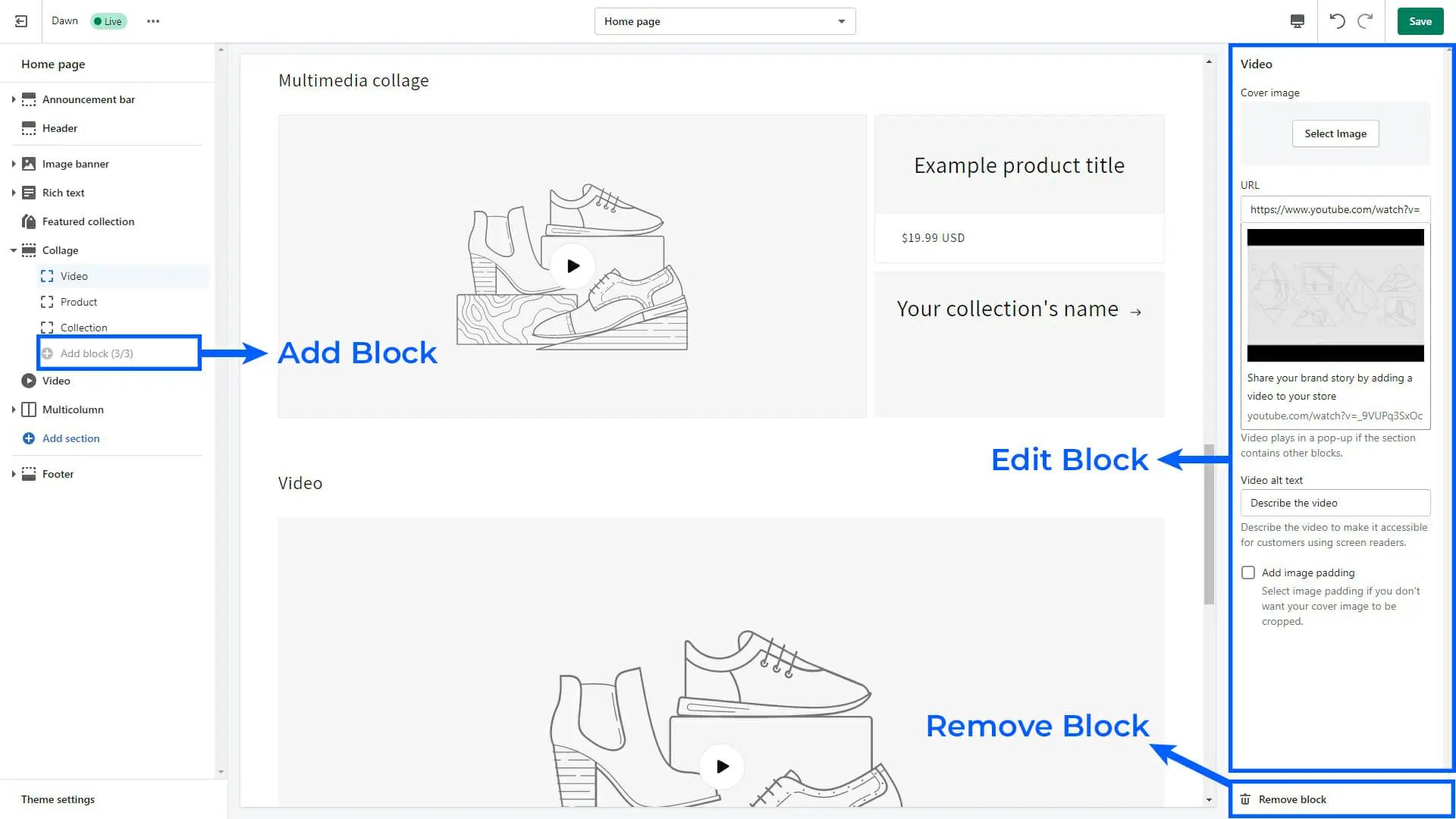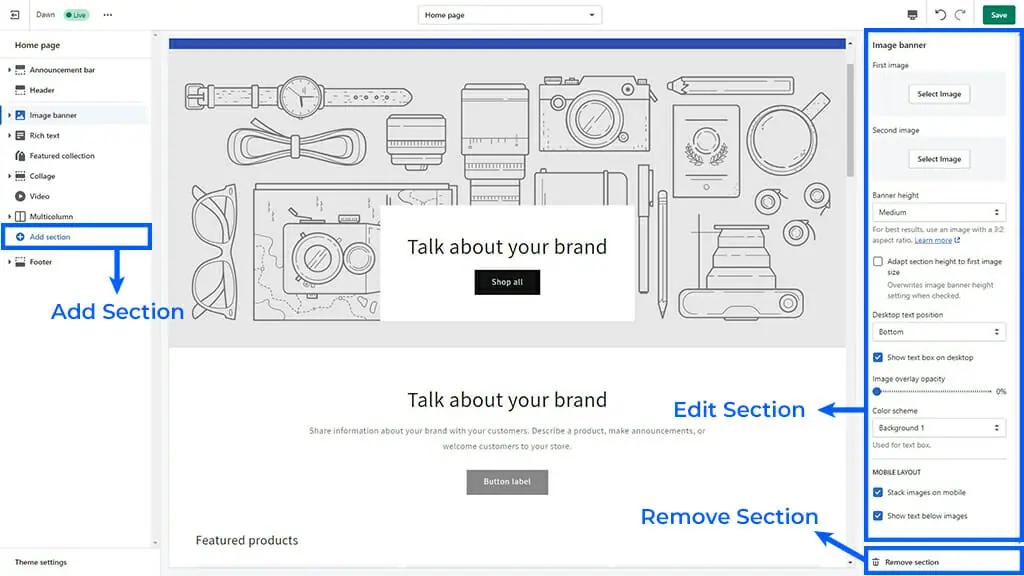 You can add, edit, and remove sections in your Shopify theme using the sidebar options in the theme editor. The Add section option is located at the end of the list of sections in the sidebar. Once you select a section, you’ll see editing options and an option to remove it at the bottom of the section settings sidebar.