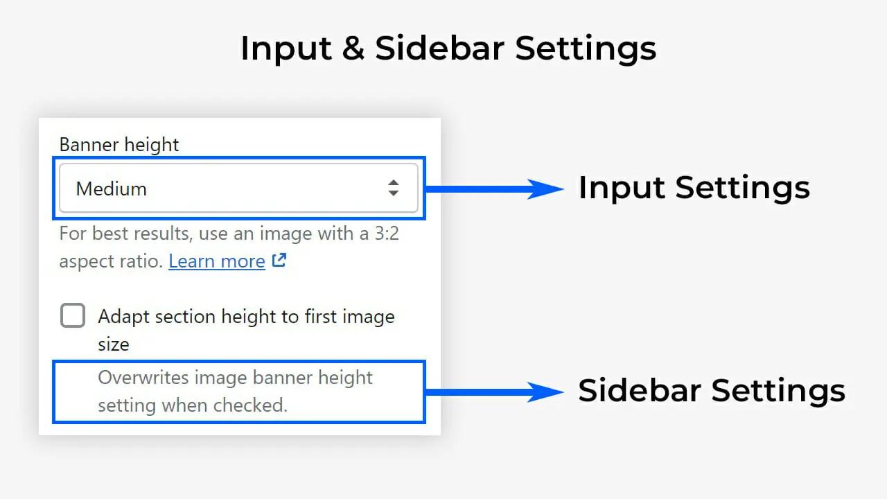 Input settings in a Shopify theme can hold a value and are configurable by store owners. In contrast, sidebar settings provide additional information about input settings. Sidebar settings cannot be configured by merchants in the theme editor.