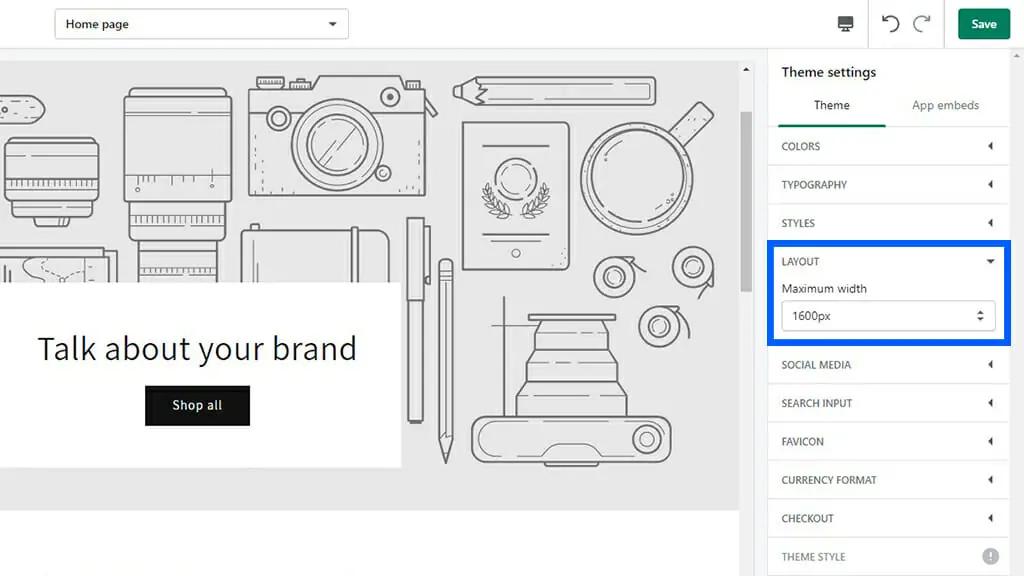 You can alter the width of your store layout using the Shopify theme editor. For example, in the Shopify Dawn Theme, you can change the maximum width of your store by navigating to Theme Settings > Theme > Layout > Maximum width and choosing an option from the available input settings in the dropdown.