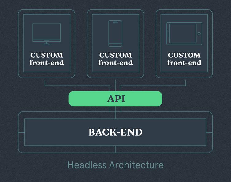 Each frontend is connected to the backend via an API integration. Whenever a visitor interacts with your brand or logs into your site from any touchpoint, that user interface sends a corresponding API call that pulls data from the backend and returns the desired response.